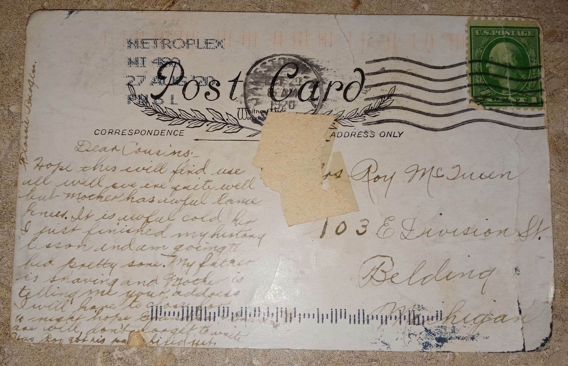 Brittany Keech, of Belding, Mich., recently received a postcard in her mailbox dated Oct. 29, 1920. CREDIT: Brittany Keech